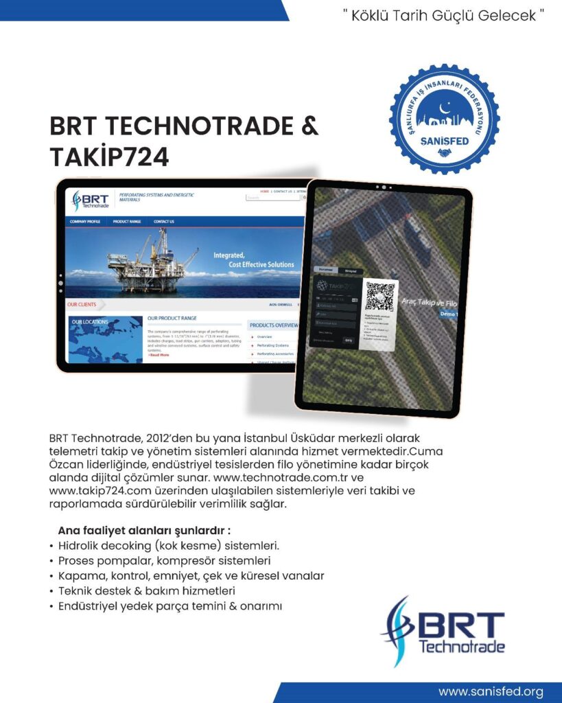 BRT Technotrade & Takip724, endüstriyel takip ve kontrol sistemleri alanında dijital çözümler sunarak ŞANİŞFED’in güçlü üyelerindendir. İstanbul merkezli firma, veri takibi ve yönetiminde sürdürülebilir verimlilik sağlamaktadır.