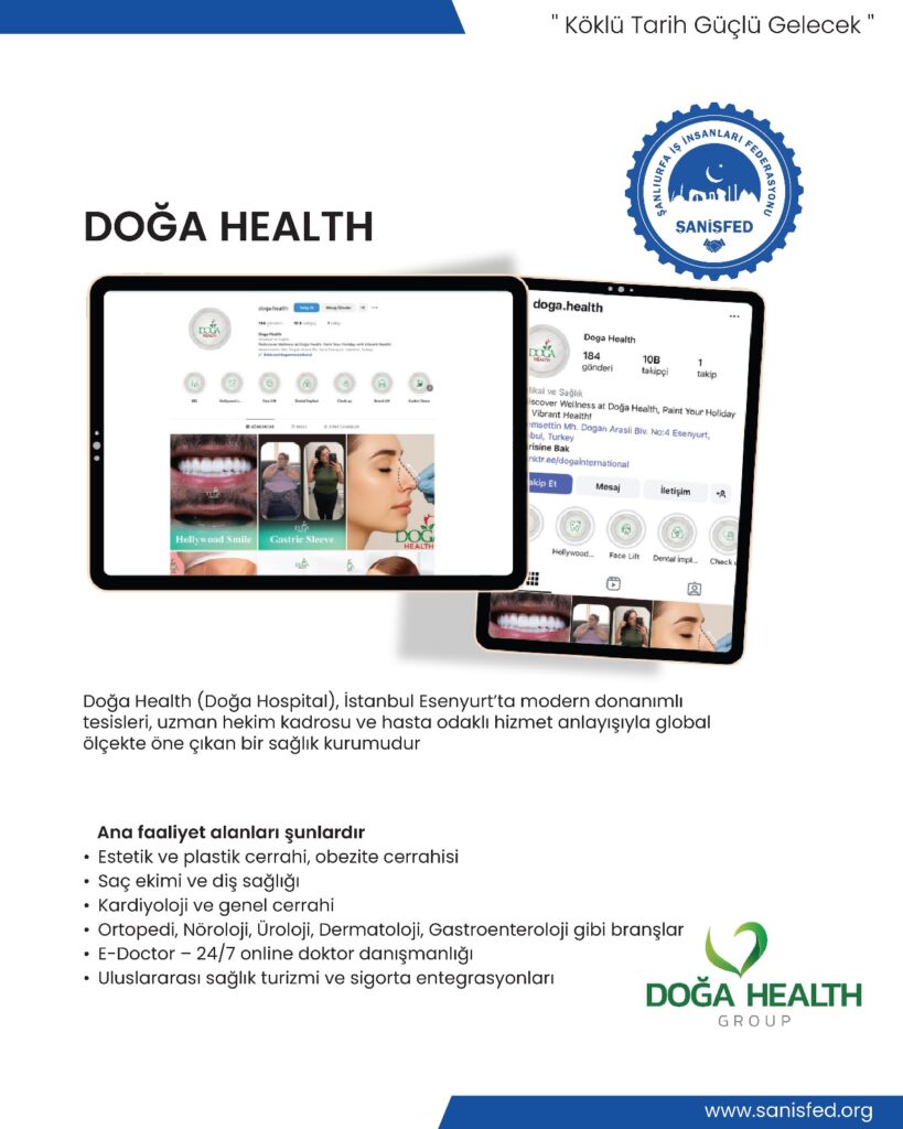 Doğa Health, modern sağlık hizmetleriyle hem yerel hem de uluslararası alanda fark yaratarak ŞANİŞFED çatısı altında sağlık sektörüne değer katan üyelerimizdendir. Hasta odaklı yaklaşımı, deneyimli kadrosu ve güçlü teknolojik altyapısıyla sağlık turizminde önemli bir konuma sahiptir.