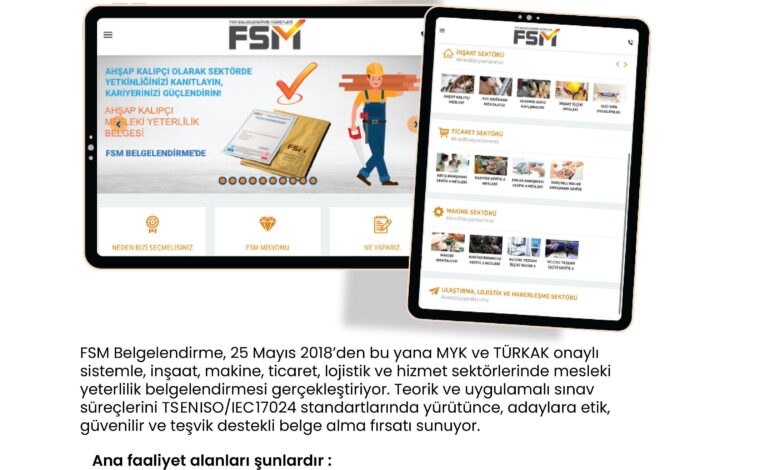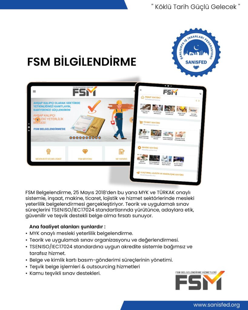 FSM Belgelendirme, MYK ve TÜRKAK onaylı yapısıyla ŞANİŞFED ailesinin nitelikli iş gücüne katkı sunan önemli üyelerindendir. Mesleki yeterlilik alanında güvenilir, tarafsız ve sürdürülebilir hizmet anlayışıyla öne çıkmaktadır.