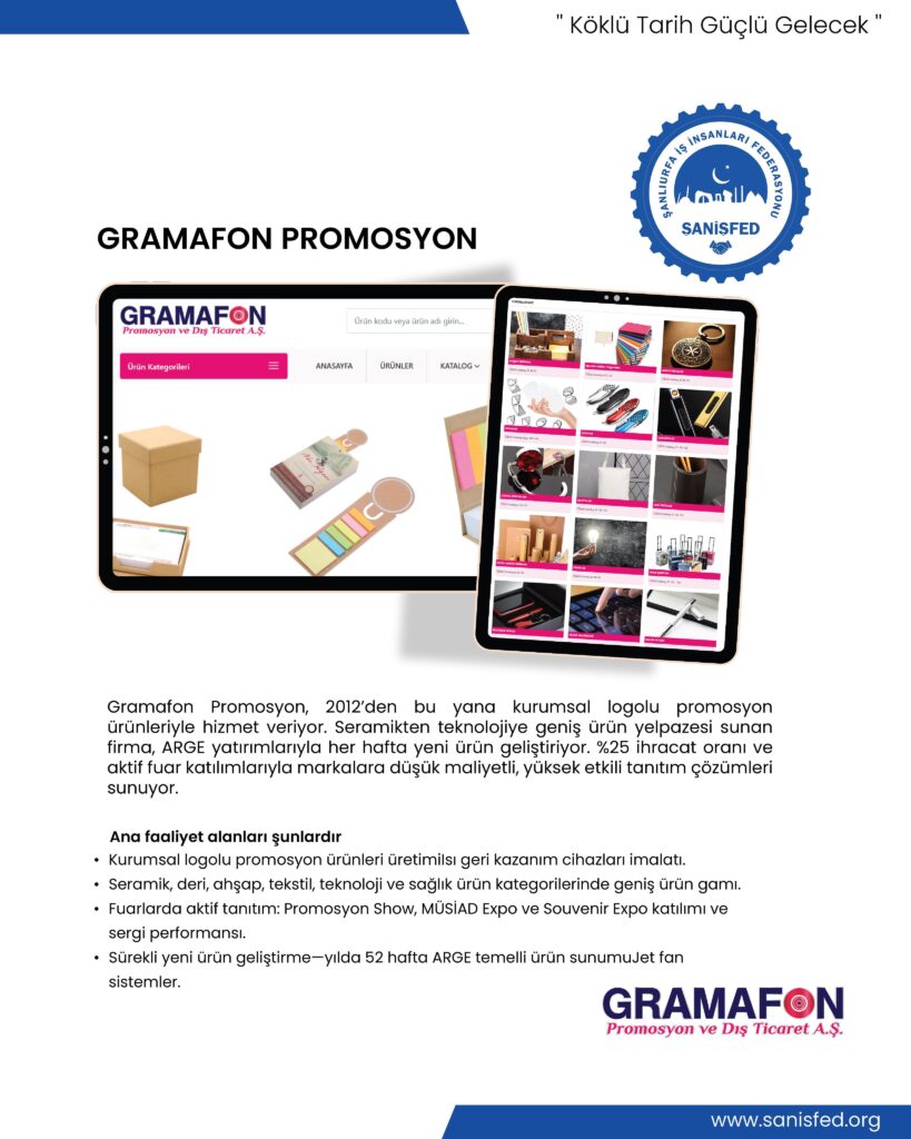 Gramafon Promosyon, yenilikçi ürün anlayışı ve ihracat odaklı yaklaşımıyla Şanişfed ailesinin aktif üyelerindendir. Promosyon sektöründeki güçlü duruşuyla bölgesel kalkınmaya katkı sunmaya devam ediyor.