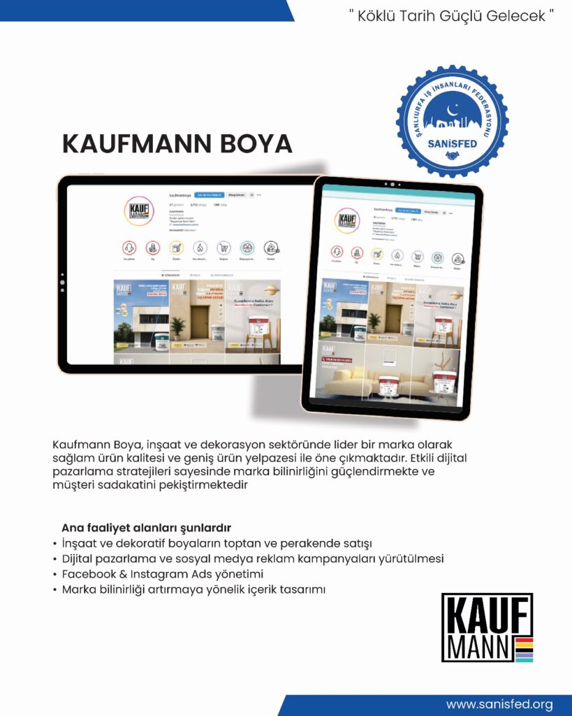 Kaufmann Boya, yapı ve dekorasyon sektöründeki güçlü konumuyla ŞANİŞFED çatısı altında bölgesel üretim gücünü temsil eden önemli markalarımızdandır. Kaliteli boya çözümleri ve yenilikçi uygulamalarıyla sektörüne değer katmaya devam etmektedir.