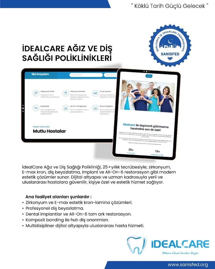 İdealCare, sağlık ve bakım alanındaki hizmet kalitesiyle ŞANİŞFED ailesinin güçlü üyelerindendir. Yenilikçi çözümleri ve profesyonel yaklaşımıyla bireylerin yaşam kalitesine değer katmaktadır.