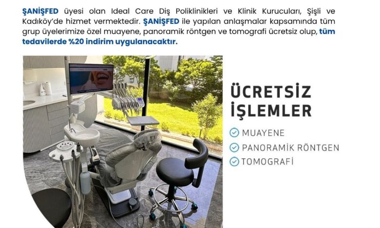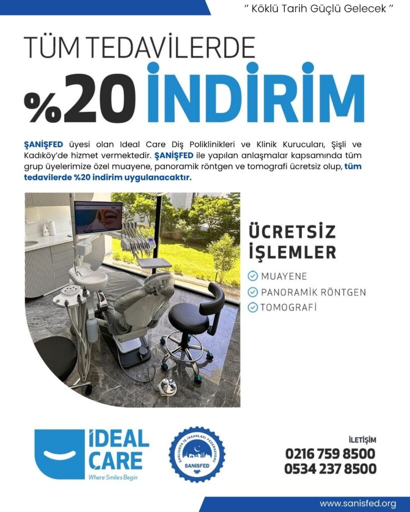 ŞANİŞFED üyesi olan Ideal Care Diş Poliklinikleri ve Klinik Kurucuları, Şişli ve Kadıköy’de hizmet vermektedir. ŞANİŞFED ile yapılan anlaşmalar kapsamında tüm grup üyelerimize özel muayene, panoramik röntgen ve tomografi ücretsiz olup, tüm tedavilerde %20 indirim uygulanacaktır.